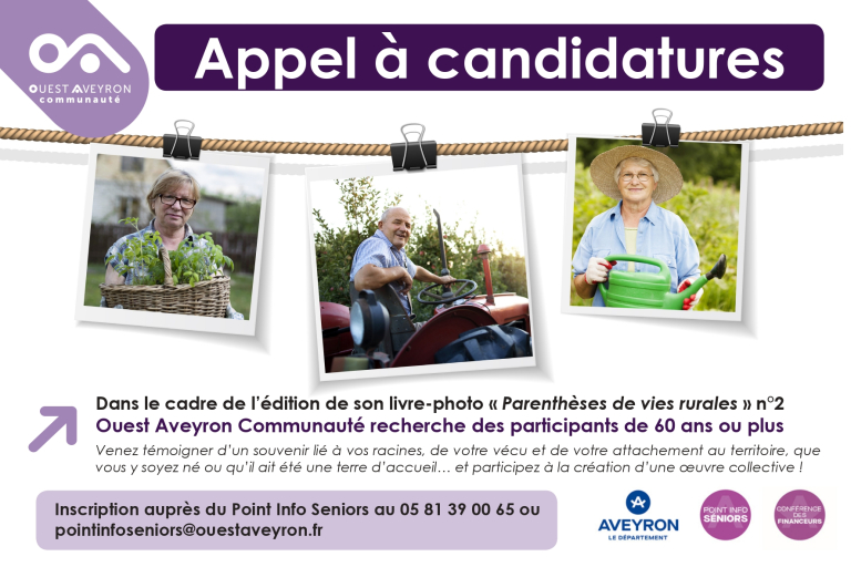 Le Point Info Séniors poursuit la recherche de témoignages sur les habitants du territoire, afin d’alimenter le futur recueil « Parenthèses de vies rurales 2 » qui sera édité en 2026. N’hésitez pas à en parler autour de vous ou à vous faire connaître si vous souhaitez participer à cette œuvre collective, en nous confiant votre histoire.