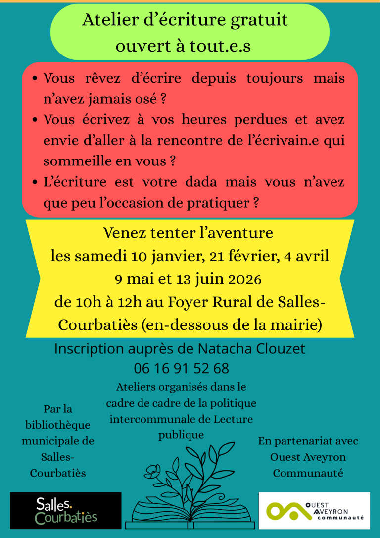 Organisés en partenariat avec la Mairie et la bibliothèque municipale de Salles-Courbatiès, ces ateliers débuteront le samedi 10 janvier. Ils seront animés par Natacha Clouzet.