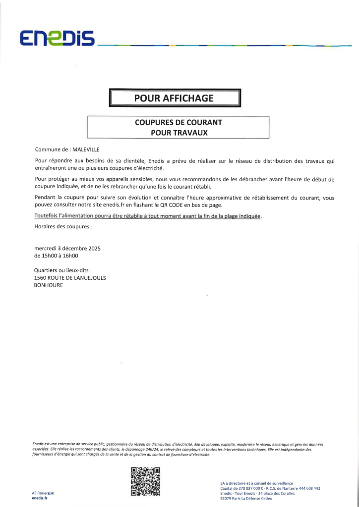 Pour répondre aux besoins de sa clientèle, Enedis a prévu de réaliser sur le réseau de distribution des travaux qui entraîneront une ou plusieurs coupures d’électricité.