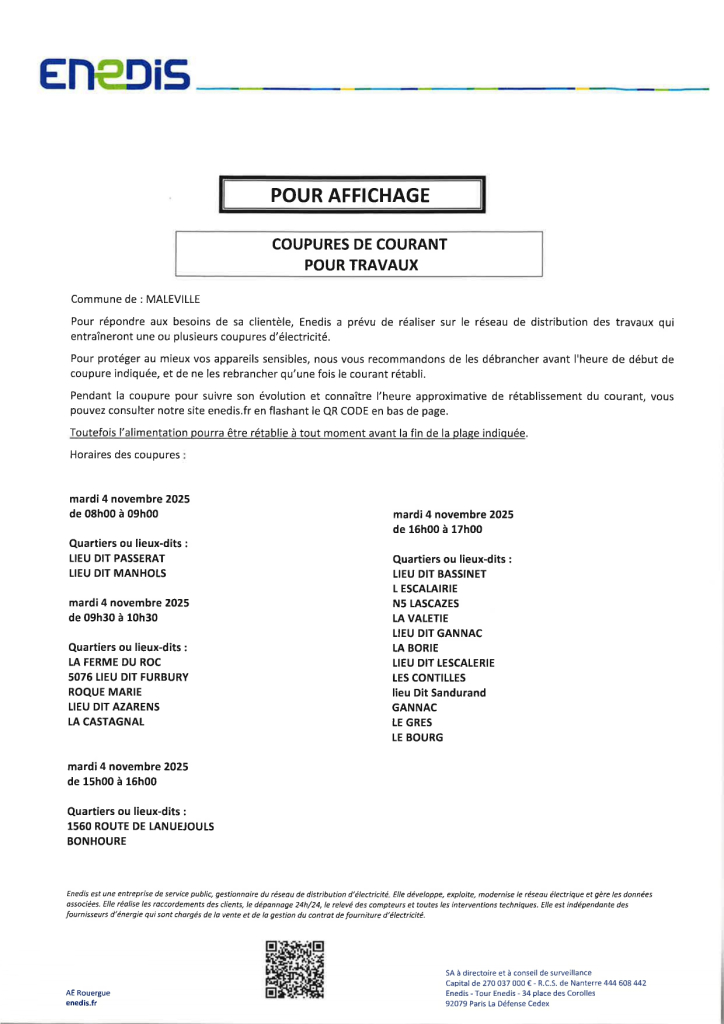 Pour répondre aux besoins de sa clientèle, Enedis a prévu de réaliser sur le réseau de distribution des travaux qui entraîneront une ou plusieurs coupures d’électricité.