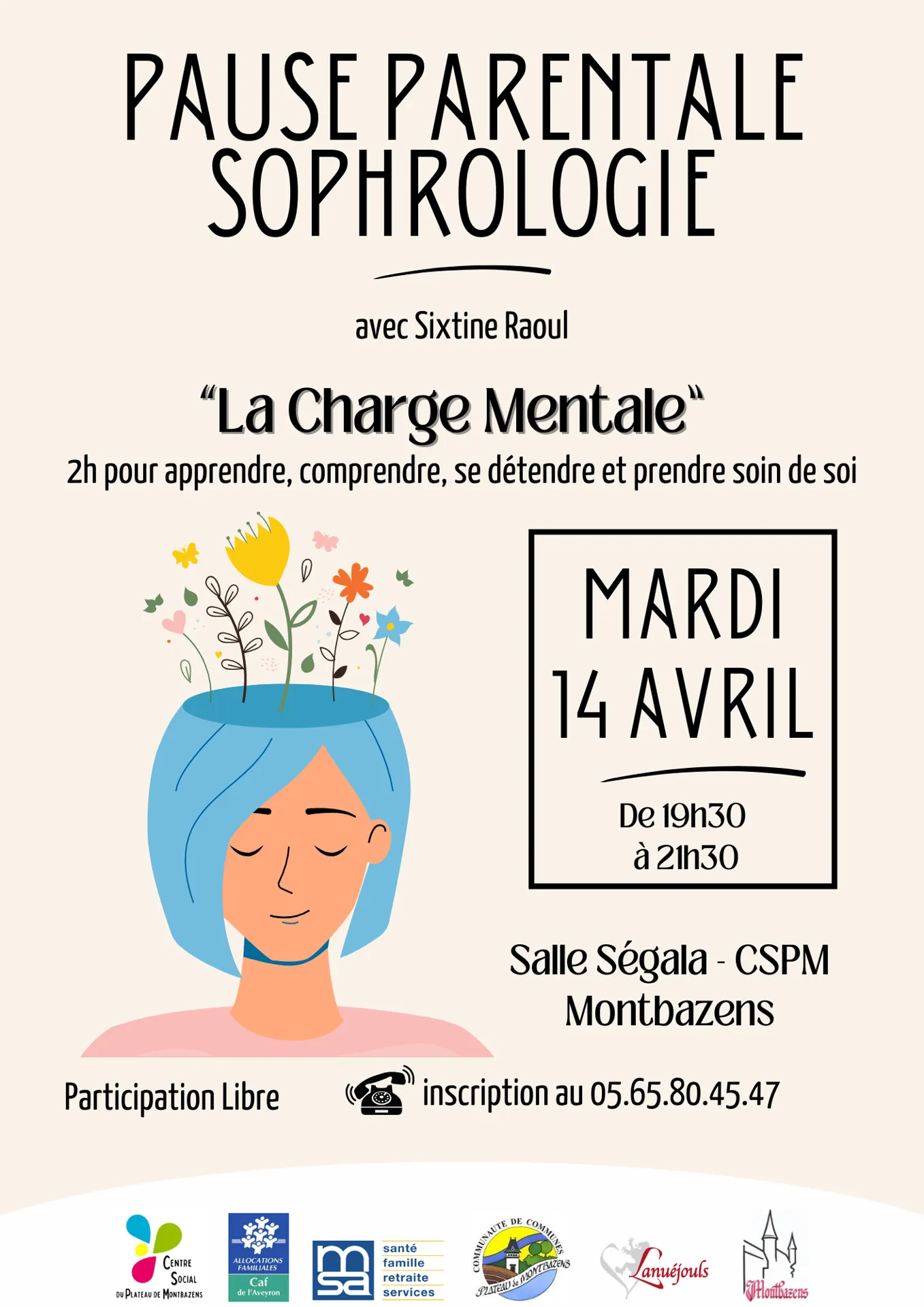 Pause parentale : la charge mentale, à la salle Ségala au CSPM de 19 h 30 à 21 h 30. 2 h pour apprendre, comprendre, se détendre et prendre soin de soin, avec Sixtine RAOUL. Inscriptions 05 65 80 45 47. Participation libre. (CSPM)