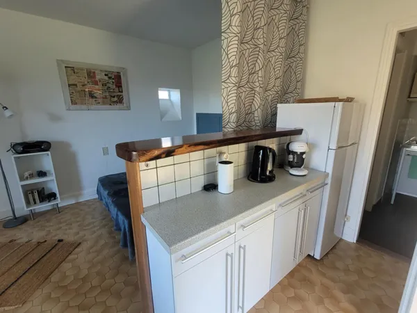 Dans la pièce principale vous trouverez : coin salon/cuisine, wifi, enceinte connectée, 2 plaques de cuisson (électrique), réfrigérateur/congélateur, micro-ondes/four, chauffage complet électrique en supplément sur relevé de compteur, un lit en 140, une salle d’eau, un lave linge et un wc indépendant.