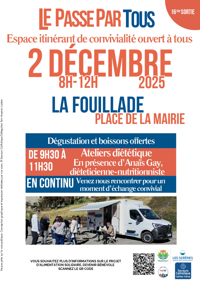 Le bus Passe par touS est de retour à La Fouillade le mardi 2 décembre de 8h à 12h. Ce lieu de convivialité itinérant est ouvert à tous, particulièrement aux personnes isolées, et vous propose ce mois-ci un atelier diététique.