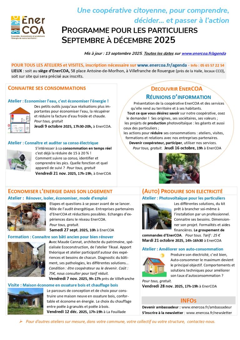 Voici l’Agenda septembre-décembre 2025 des Ateliers et formations d’EnerCOA pour les particuliers.