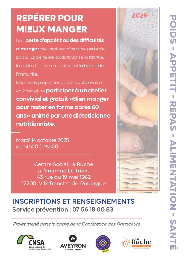 Atelier nutrition organisé par Eopla : le mardi 14 octobre à 14h, au centre social La Ruche, rue Bories à Villefranche de Rouergue. Inscription obligatoire.