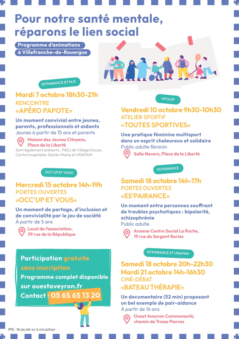 Vous êtes invité·e·s à participer aux semaines d’information sur la santé mentale qui ont lieu du 6 au 19 octobre 2025 : « pour notre santé mentale, réparons le lien social ».
